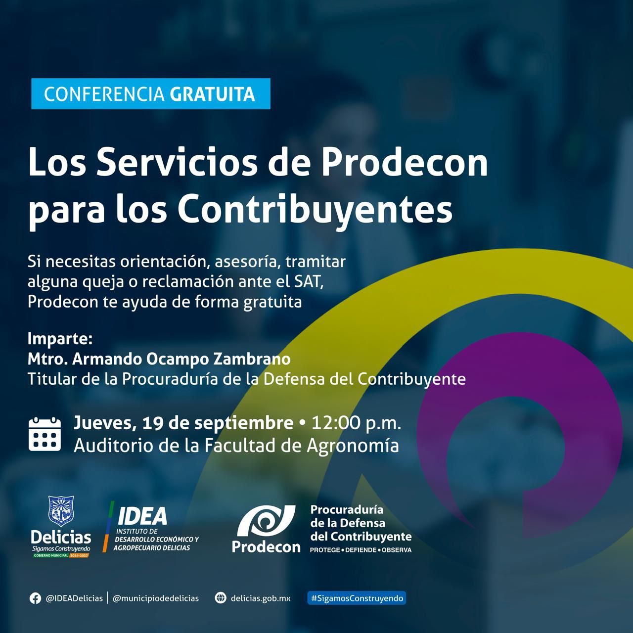 El Gobierno Municipal de Delicias, a través del Instituto de Desarrollo Económico y Agropecuario (IDEA), invita a todos los contribuyentes a participar en la conferencia gratuita “Los Servicios de Prodecon para los Contribuyentes”. Esta conferencia, dirigida por el Mtro. Armando Ocampo Zambrano, titular de la Procuraduría de la Defensa del Contribuyente (Prodecon), ofrecerá orientación, asesoría y apoyo para tramitar quejas o reclamaciones ante el SAT de forma gratuita.