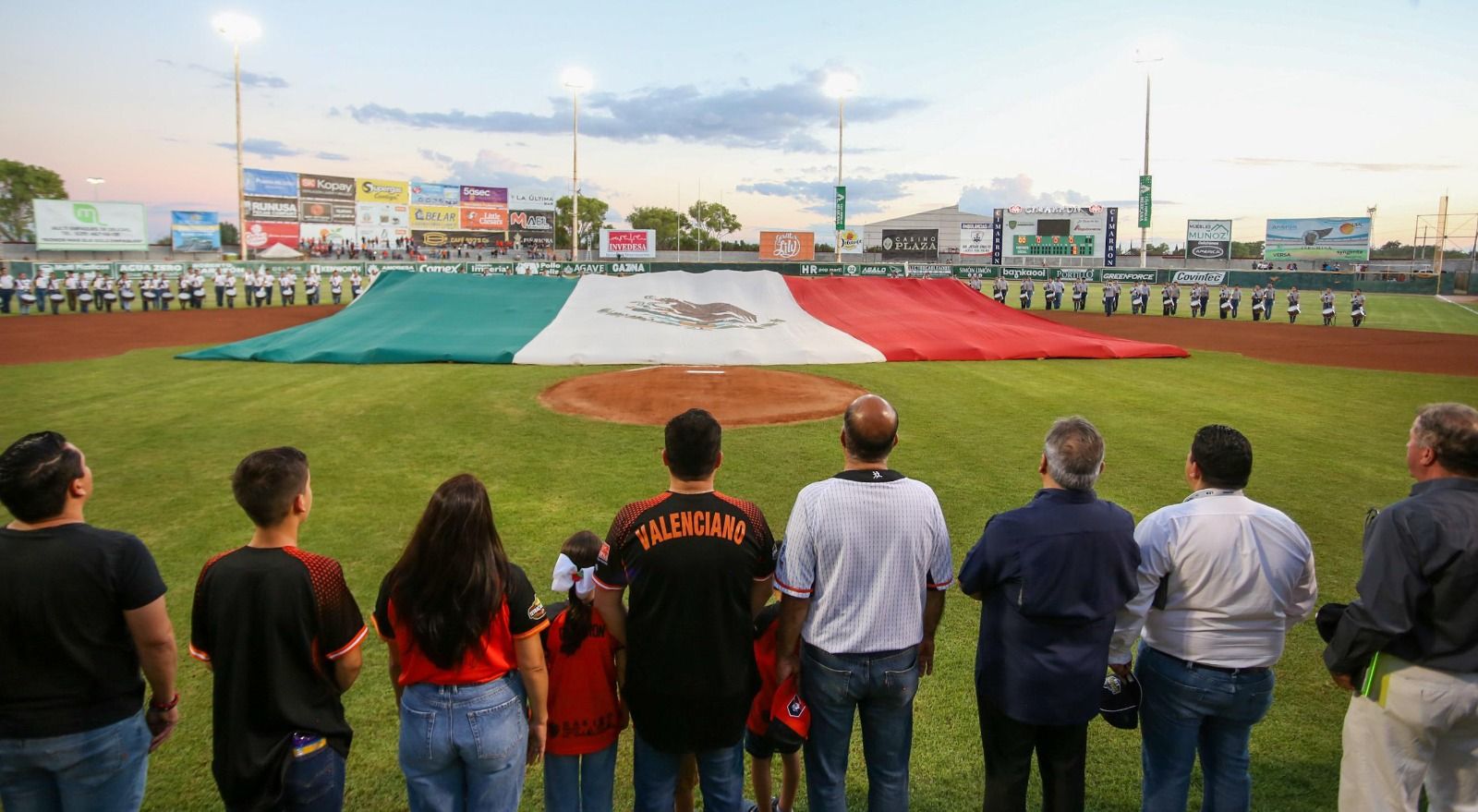 El Gran Estadio de Delicias se llenó de emoción al recibir a los aficionados que quisieron presenciar el inicio de esta emocionante serie final. Antes del juego, se llevó a cabo la ceremonia de Honores a la Bandera, donde el 66 Batallón de Infantería desplegó la Mega Bandera, que ondeó majestuosamente mientras se entonaba el Himno Nacional.